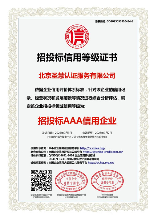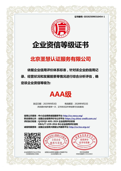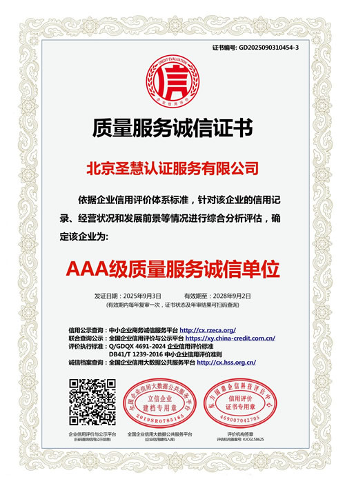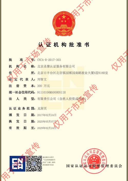 北京圣慧认证服务有限公司(简称"圣慧认证",英文缩写SHQC)是经中国国家认证认可监督管理委员会(CNCA)正式批准设立的权威第三方认证机构,批准证书号为CNCA-R-2017-303。作为我国认证认可体系的重要组成部分,公司自成立以来始终根植于首都北京,面向全国各行各业提供专业化、标准化的认证服务,在助力企业提升管理效能、增强市场公信力的实践中,逐步发展成为业内备受信赖的技术服务机构。
